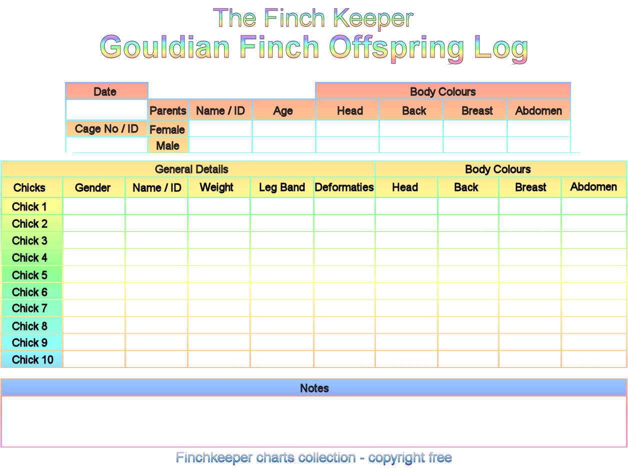 Although Gouldian Finches rarely produce 10 chicks in a clutch, it is not unheard of. This chart does allow for up to 10 chicks at a time to be logged.